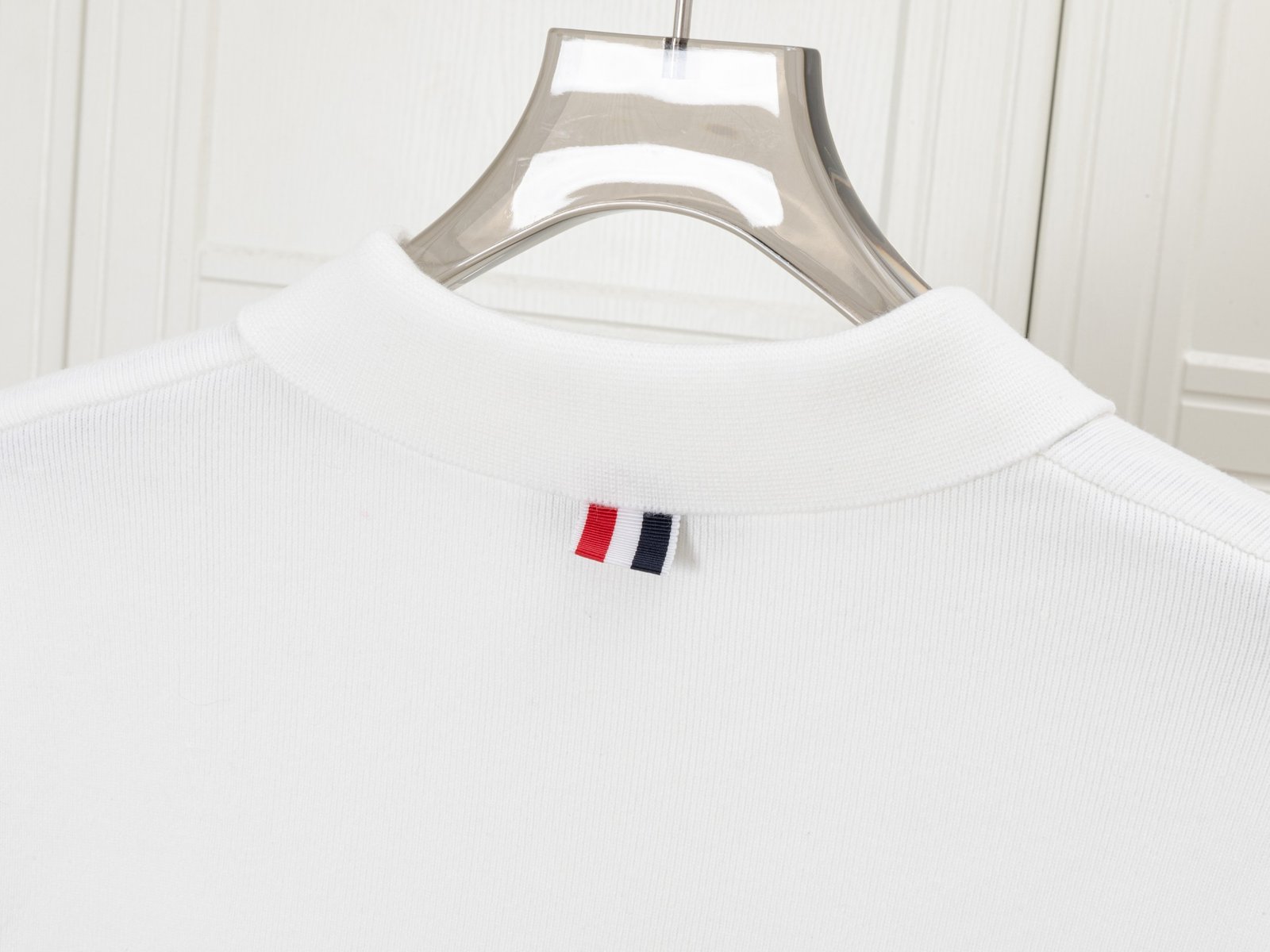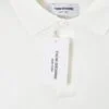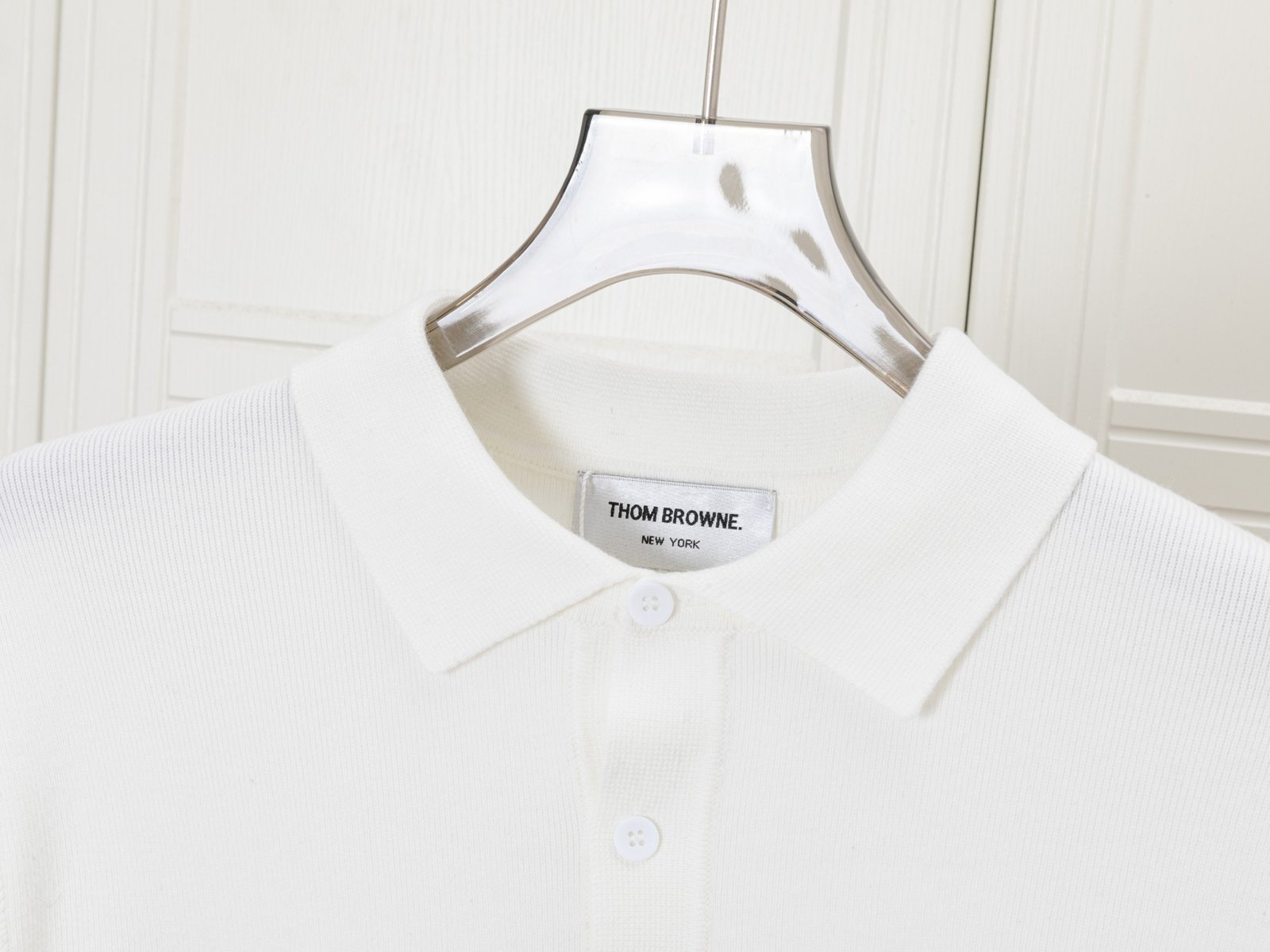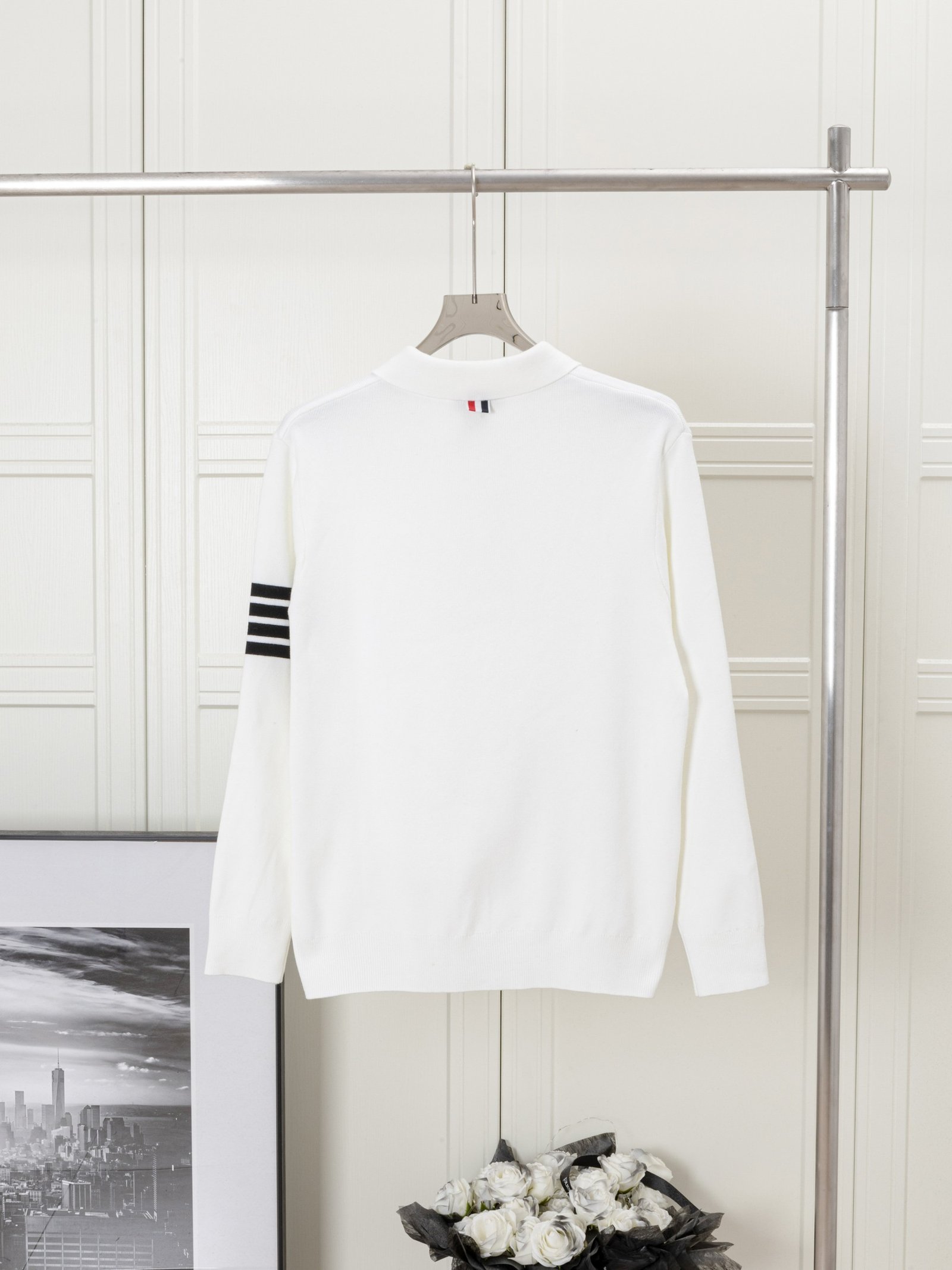 A clean and elegant long-sleeve polo sweater featuring a minimalist white design accented with signature four-stripe detailing on the sleeve, crafted for refined everyday wear.