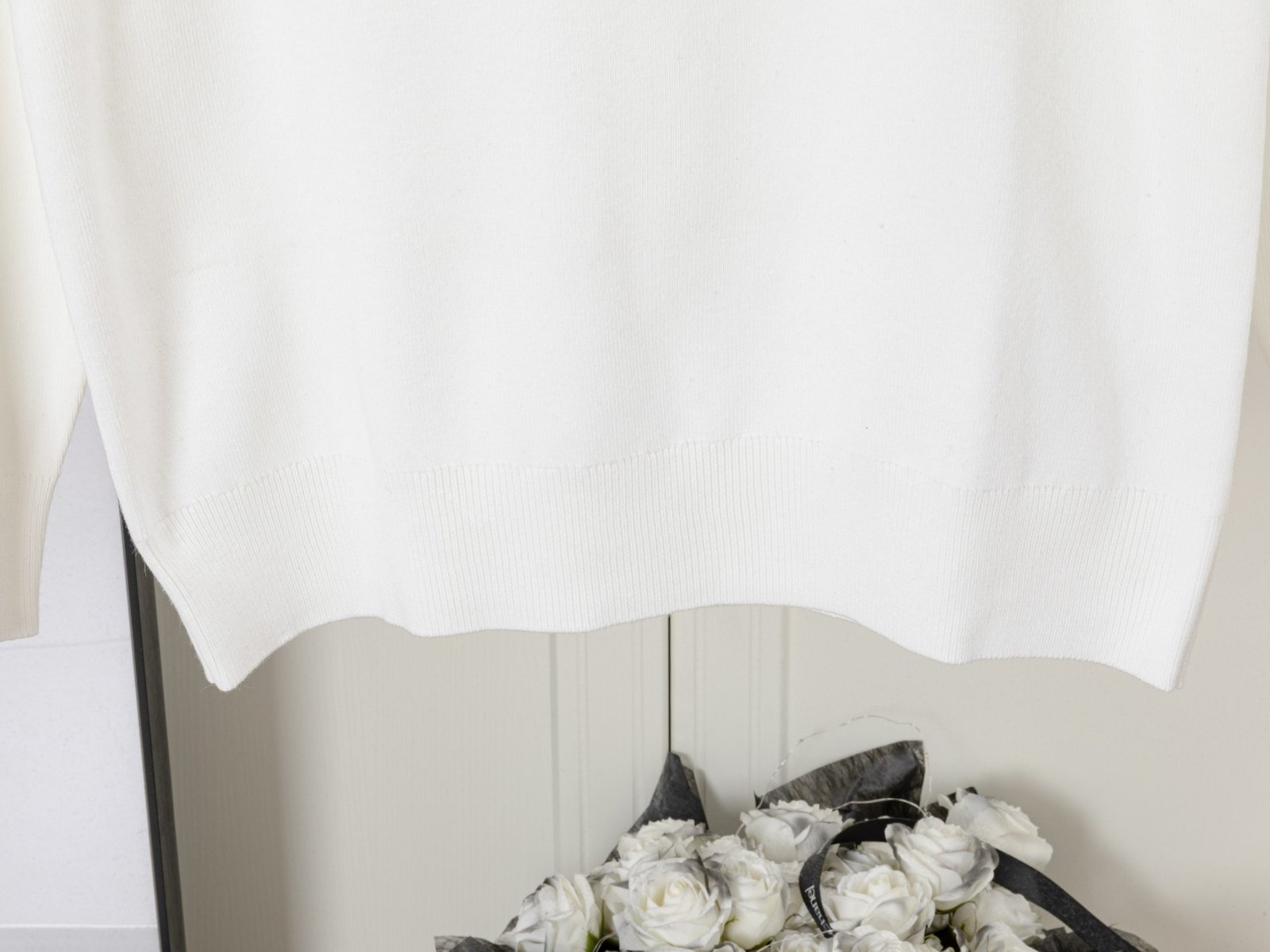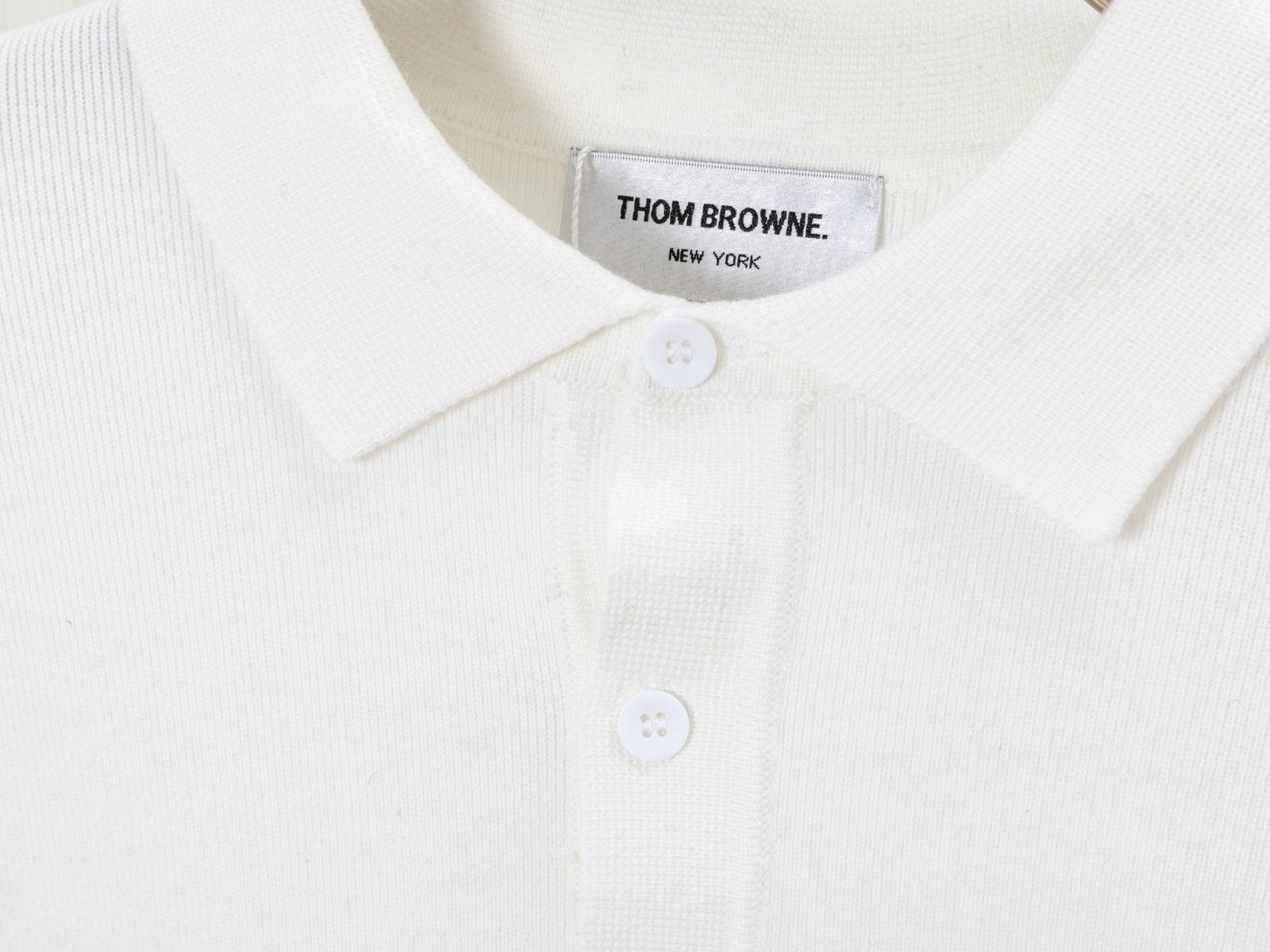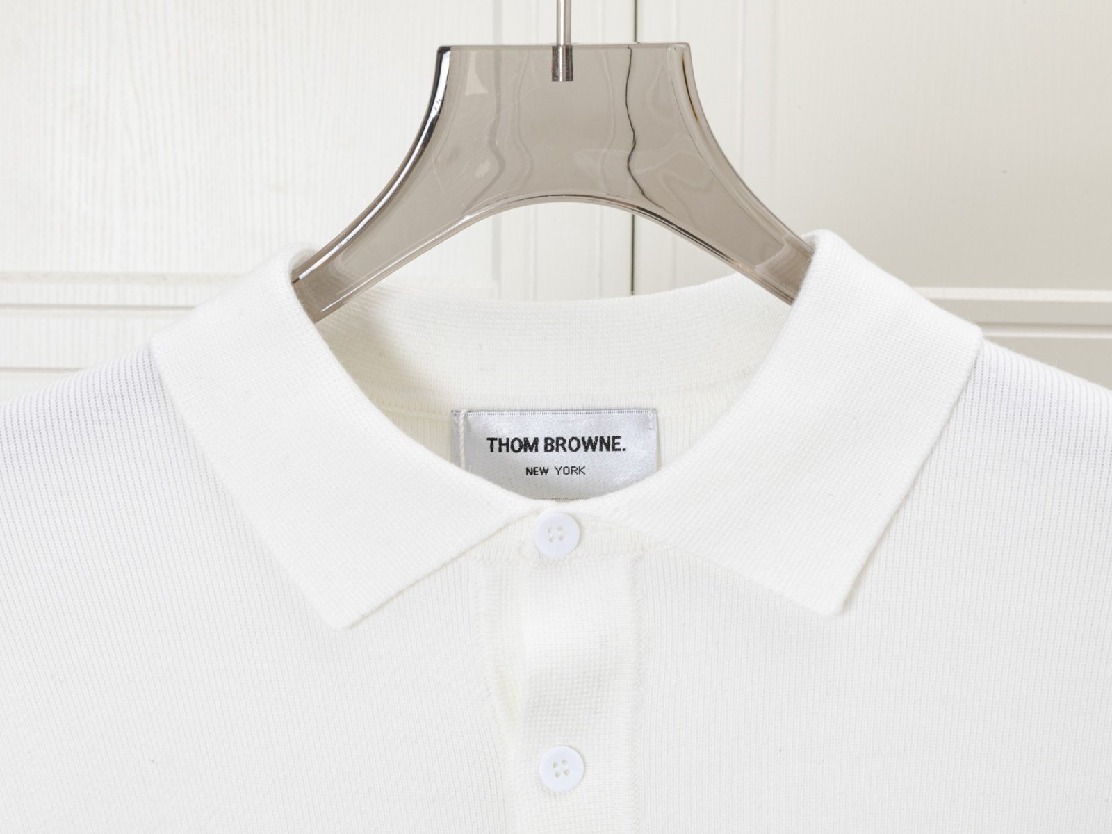 A clean and elegant long-sleeve polo sweater featuring a minimalist white design accented with signature four-stripe detailing on the sleeve, crafted for refined everyday wear.