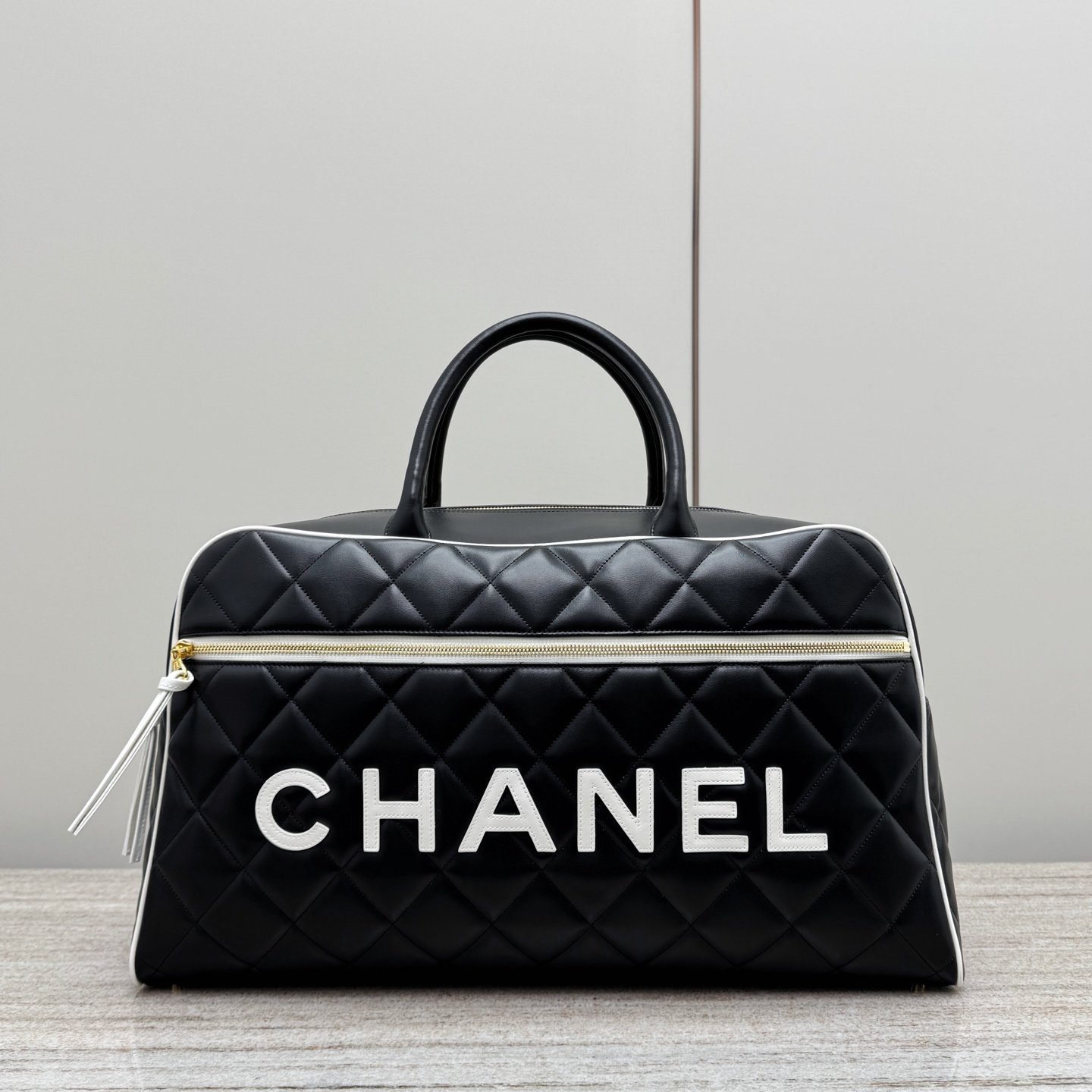 Authentic CHANEL Boston bowling bag in black quilted leather with white logo and zippered top practical, stylish, and perfect for everyday chic.