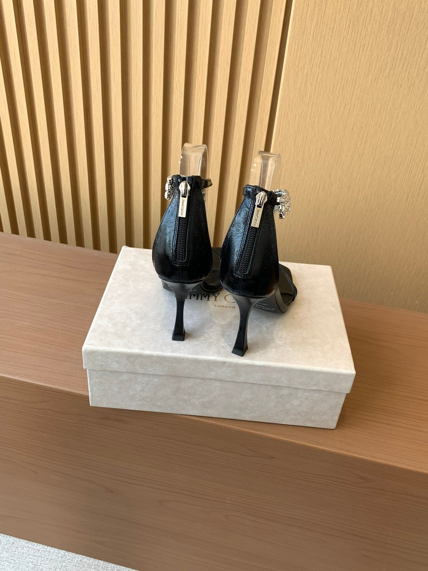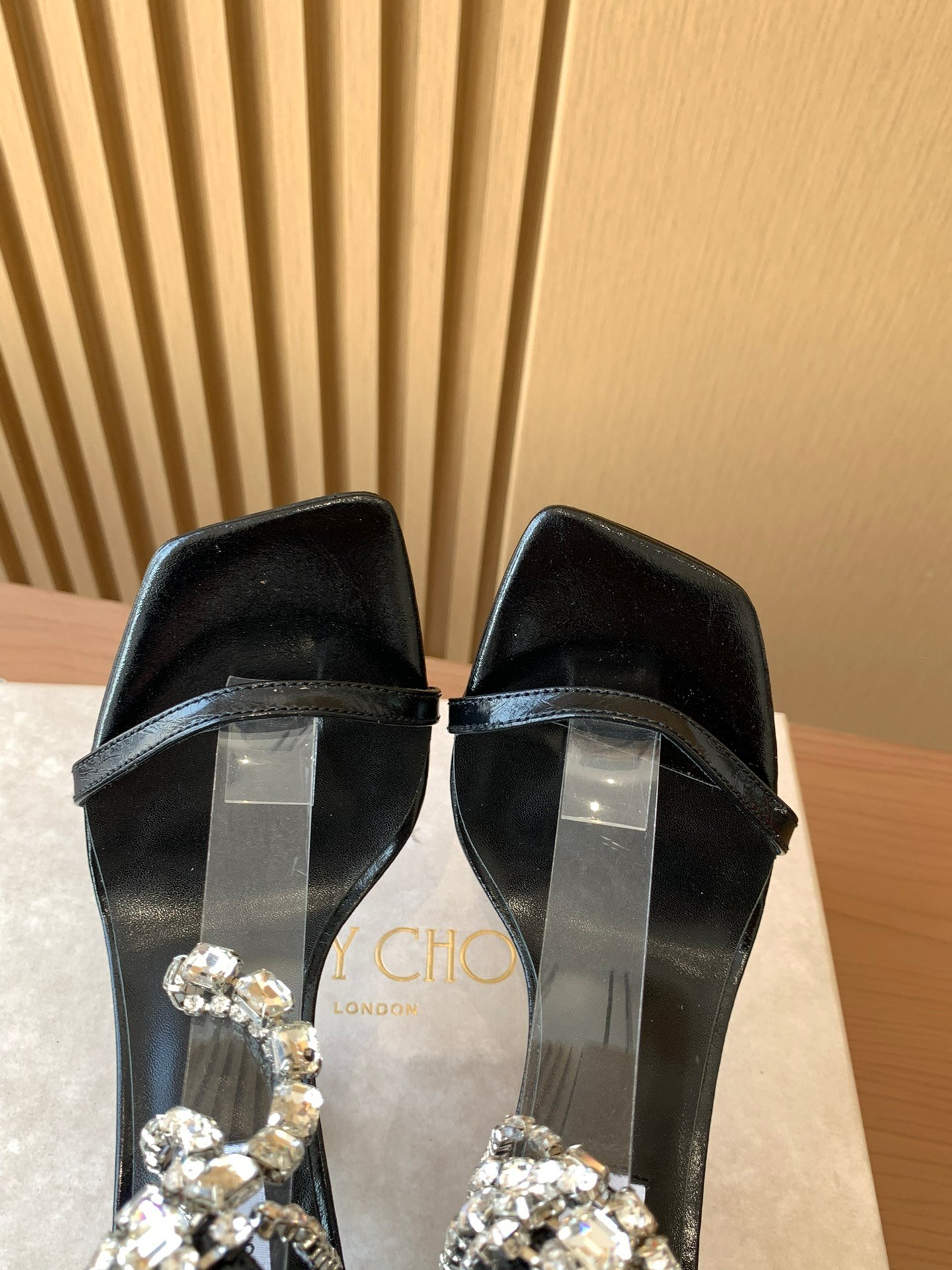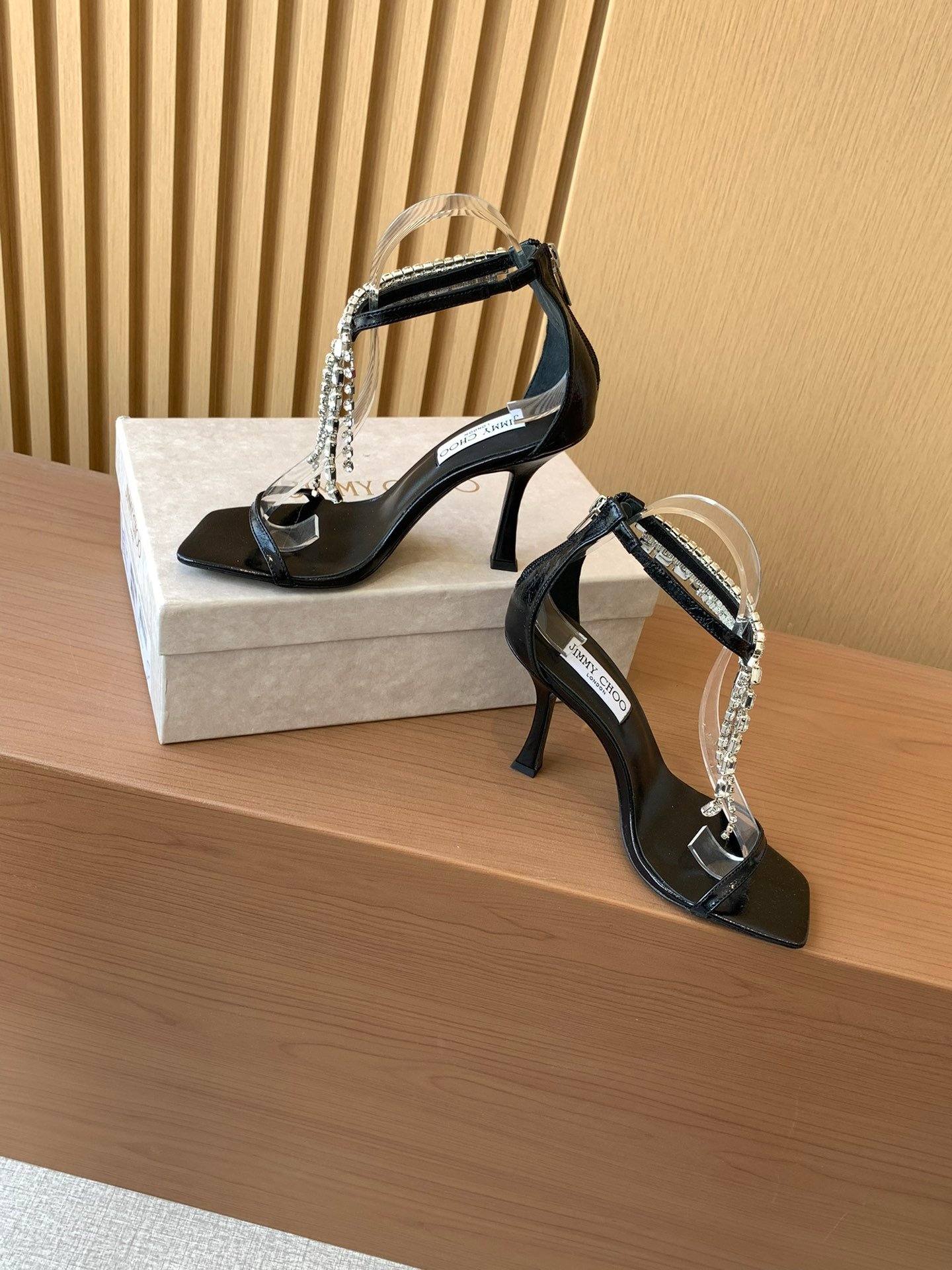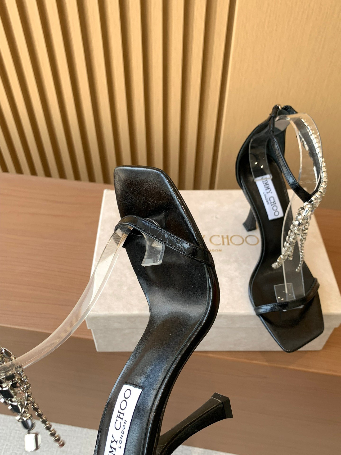 A glamorous square-toe high-heel sandal from Jimmy Choo’s 2025 collection, featuring sparkling rhinestone chain detailing and a bold silhouette designed for statement evening wear.