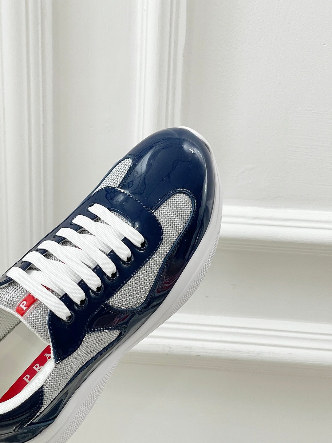 A refined Prada sneaker in a navy and white colorway, combining a timeless silhouette with lightweight comfort for everyday casual wear.