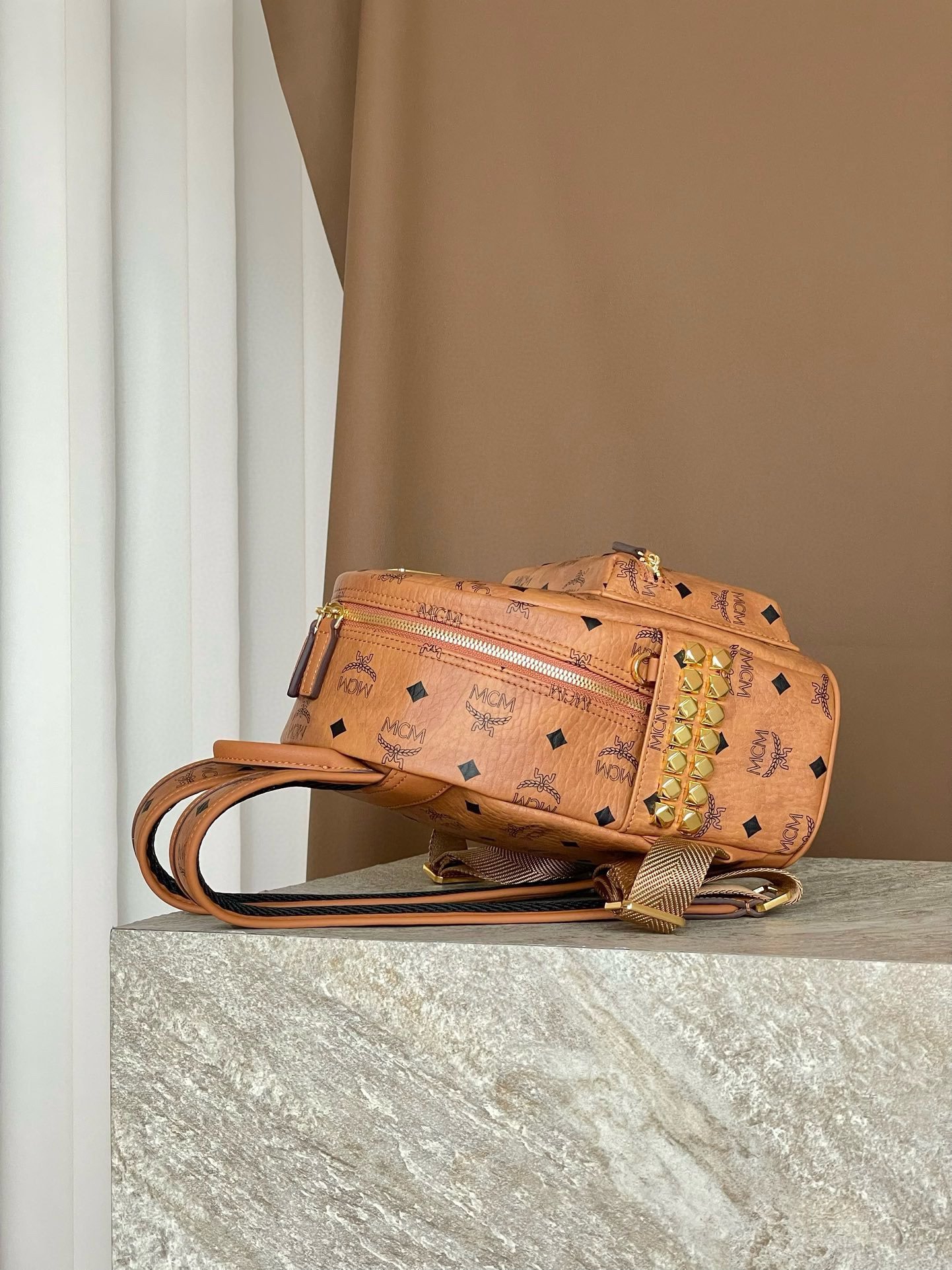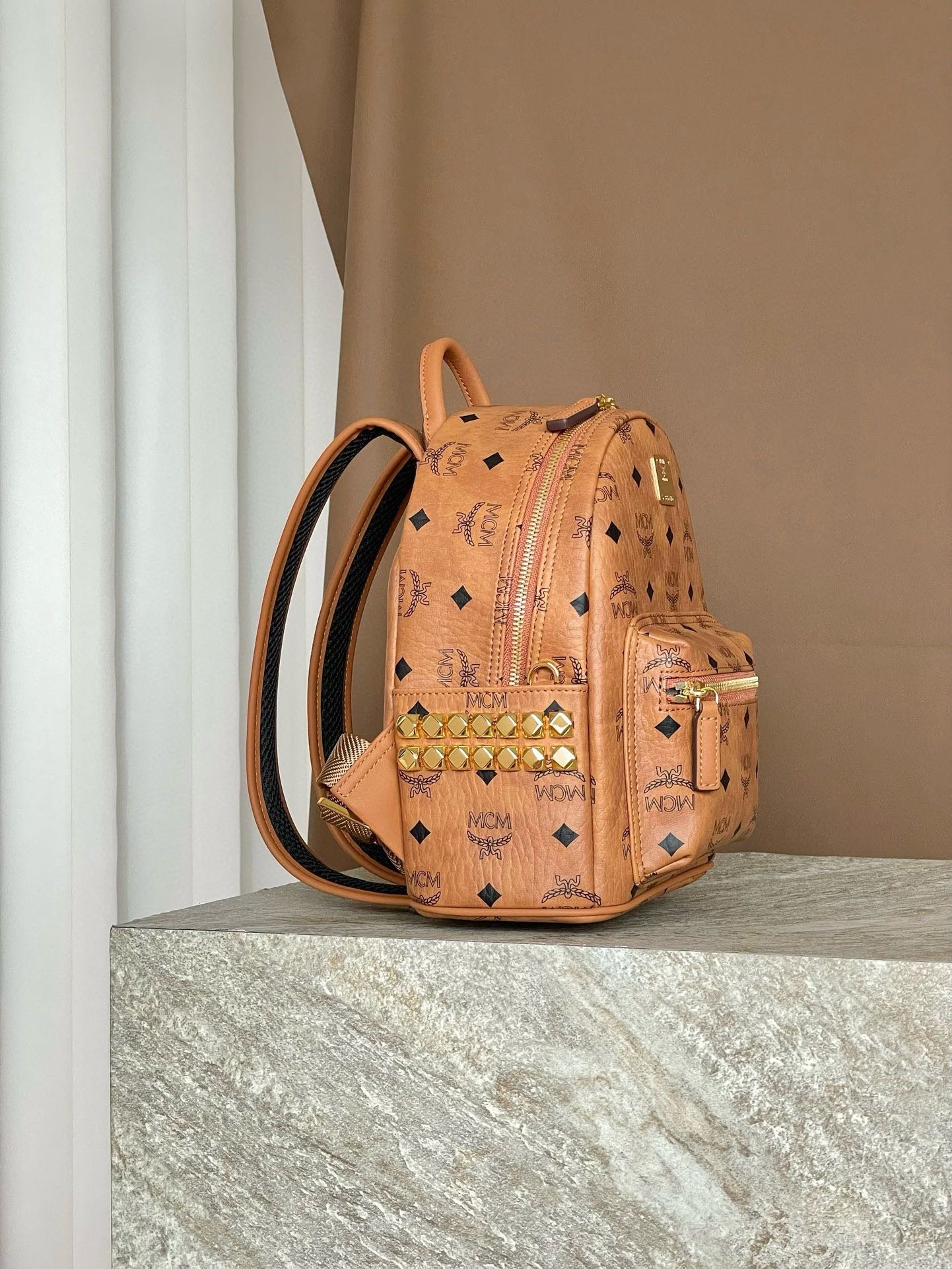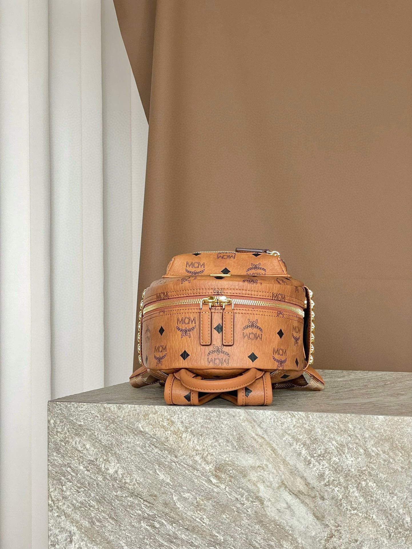 MCM Mini Stark Backpack in Visetos with Studs – Cognac