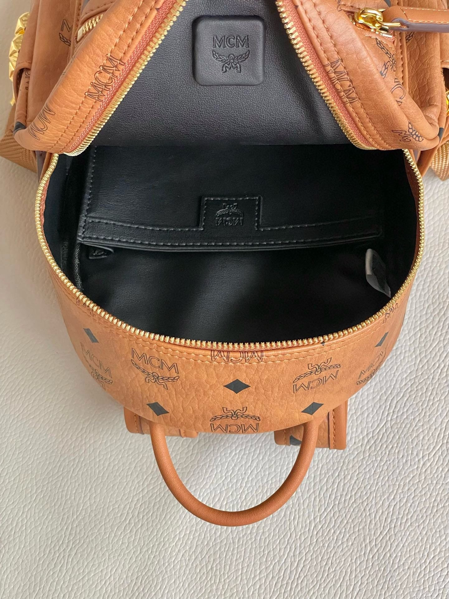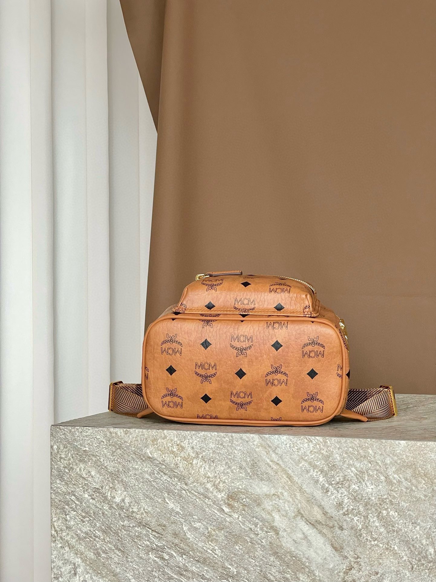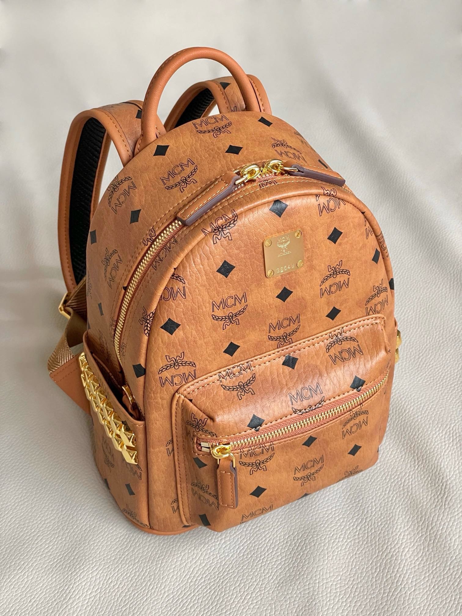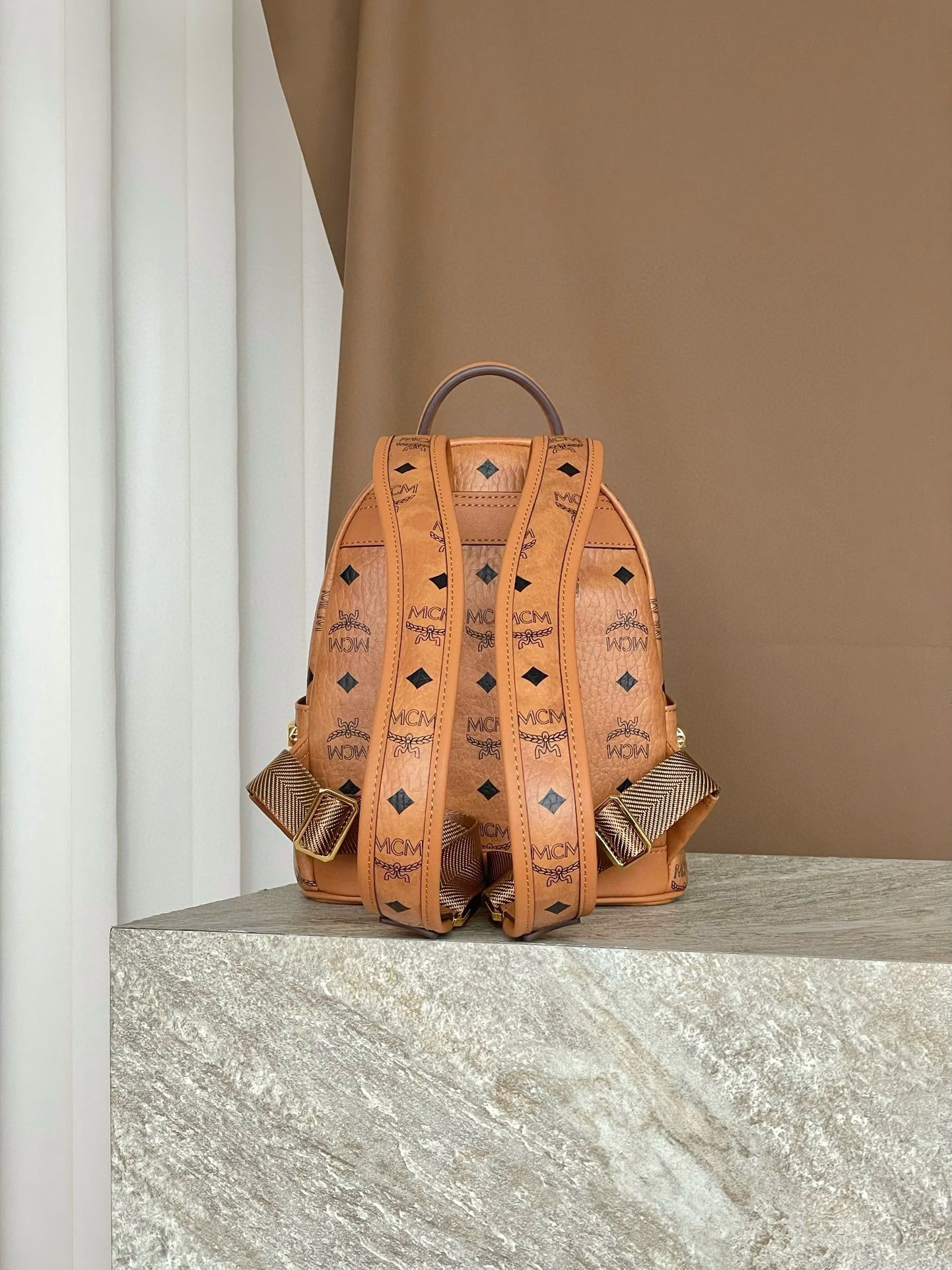 MCM Mini Stark Backpack in Visetos with Studs – Cognac
