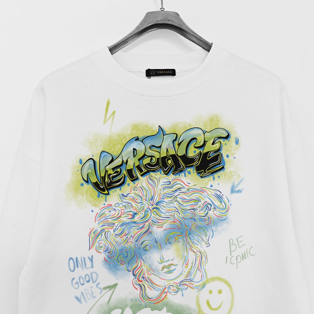 Versace 380g Printed Terry Crew Neck Sweatshirt – White (Graffiti Medusa Print)