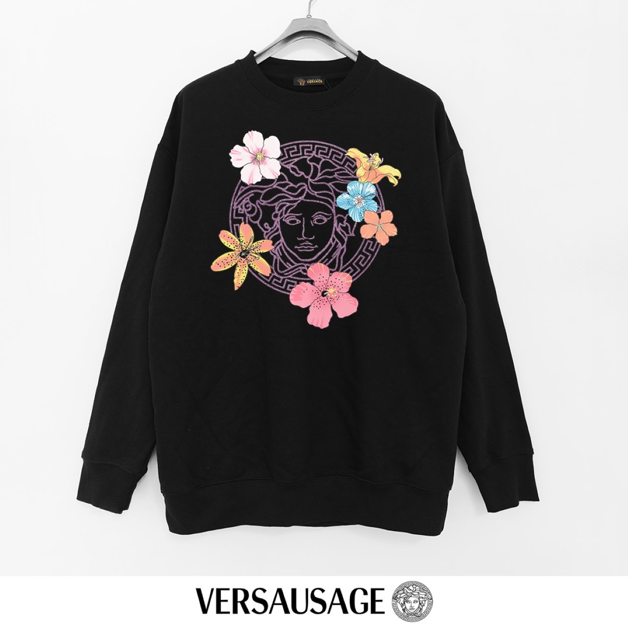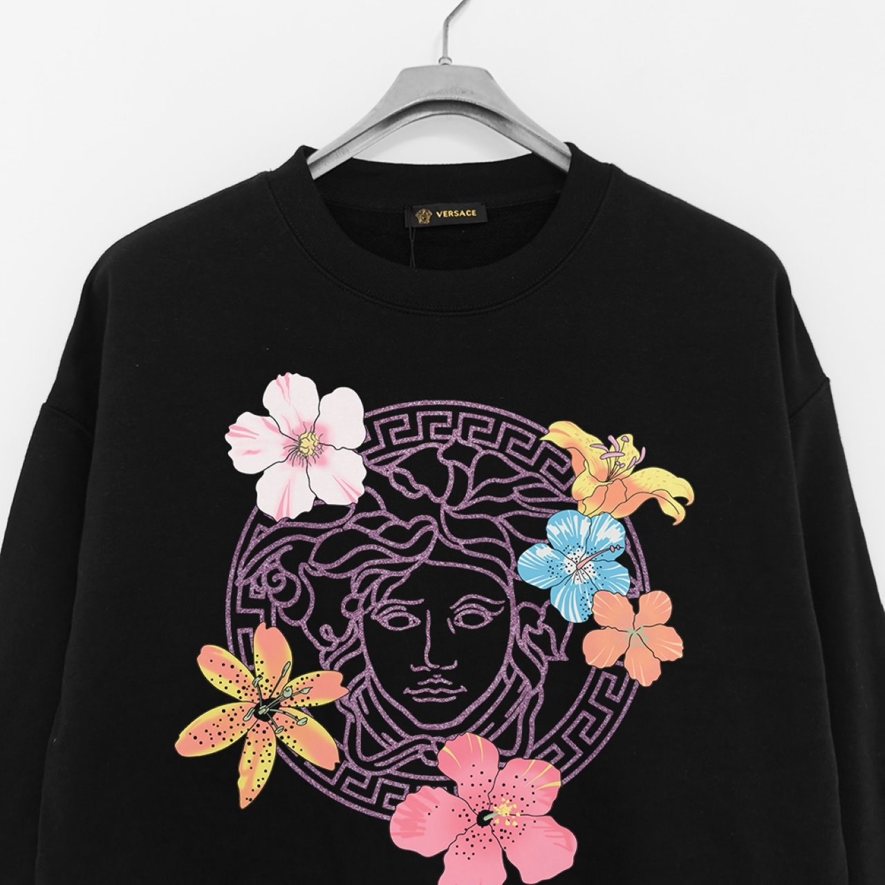 Versace 380g Printed Terry Round Neck Sweatshirt – Black (Floral Medusa Design)